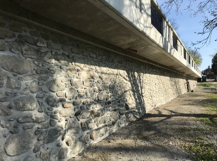 Nach der Fertigstellung der Arbeiten auf der Fahrbahnoberfläche und der Inbetriebnahme der Brücke wurde die Gewölberüstung demontiert und die Gewölbekonstruktionen sowie die Stützmauer mit dem Hochdruckdüsen-Wasserstrahlverfahren behandelt. Die Druckstärke von 1.200 bar wurde vorab auf Referenzflächen getestet. Bei diesen Arbeiten und den zusätzlich notwendigen Untersuchungen des Bauwerks wurden im Bereich der Gewölberückseite Kavernen entdeckt, die mittels Mörteleinpressverfahrens aufgefüllt wurden. Das Natursteinmauerwerk wurde bis 80 mm in die Tiefe verfugt. Diese Verfugung erfolgte - wiederum in Abstimmung mit den Denkmalschützerinnen und Denkmalschützern - mit einem Kalkmörtel mit max. 5 % Weißzementzusatz für weiche und poröse Gesteinsorten und max. 10 % für die magmatischen Gesteine. Die Fugensichtfläche wurde weder mechanisch geglättet noch auf andere Weise behandelt. Vielmehr wurde der Mörtel durch Sand im natürlichen Farbton der historischen Mörtel verfärbt. Fehlendes oder abgewittertes Natursteinmauerwerk wurde unter Berücksichtigung der Fugenverteilung mit dem freigegebenen Bruchstein ergänzt.