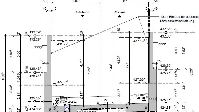 In einer Höhe von 1,1 m über der Fahrbahn wurde eine Vertiefung von 10 cm für die optionale Anbringung von Lärmschutzelementen ausgeführt.