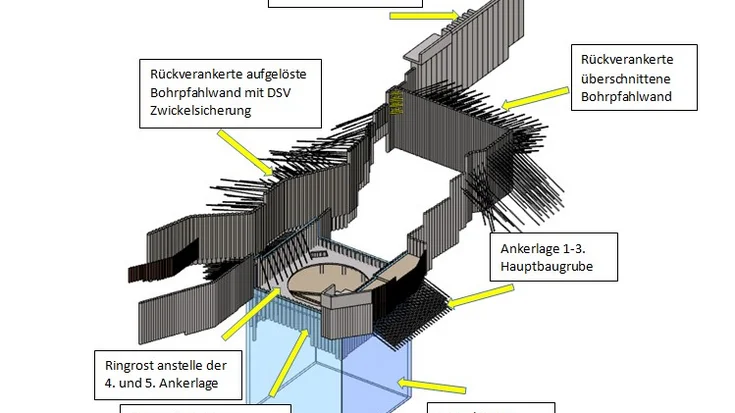 Da die Errichtung gegen drückendes Wasser ein großes Risiko darstellt, wurde auch hier eine Alternativvariante überlegt. Als Ergebnis wurden die beiden am tiefsten liegenden Ankerhorizonte durch einen innenliegenden Ringrost ersetzt, der die aussteifende Wirkung übernimmt. Nach dem Einbau der Bodenplatte unterhalb des Ringrosts übernimmt diese die Lasten aus der Baugrubensicherung und der Ringrost kann wieder abgebrochen werden.
