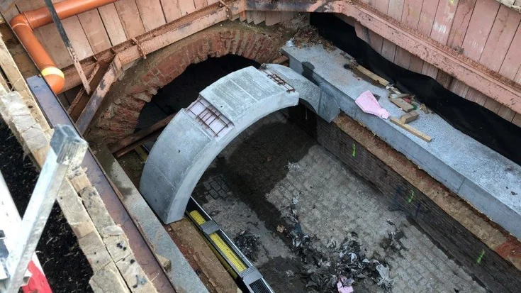 Zum Abschluss wurde der Treppenturm abgebaut, das Kanalgewölbe mittels Betonfertigteile verschlossen und die Baugrube verfüllt.