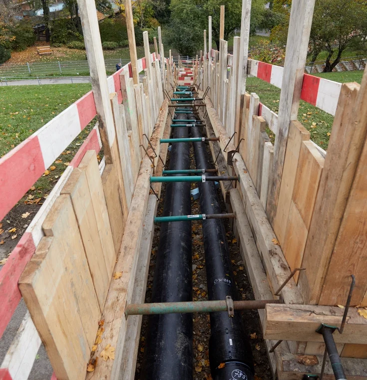 Nach Herstellung der Künetten wurden Styrodur-Unterlagen hergestellt auf denen mit dem Vor- und Rücklauf zwei parallel laufende Rohrleitungen verlegt werden. Der Vorlauf wurde als vorisolierte Kunststoffleitung mit werkseitig gedämmten Kunststoffmantelrohr in der Dimension DA 280 PE/KMR 400 und der Rücklauf als unisoliertes Kunststoffrohr DA 280 PE ausgeführt. Zur Überprüfung der Dichtheit der Schweißnähte wurde mit Wasser eine Druckprüfung durchgeführt.