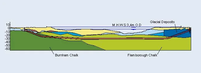 The tunnel will be excavated at a minimum cover of 5m and a maximum cover of 33m. From a geological perspective, the tunnel will initially be driven through approximately 4,000m of chalk formations (Burnham Chalk Formation and Flamborough Chalk Formation). At the end of the tunnel drive, we will encounter glacial deposits (soils composed of sand, gravel, silt and clay) over a length of approximately 800m, and young alluvial soils around the target shaft. Tidal patterns of up 6.5m must be taken into account when planning the works. The planned vertical alignment follows a decline of the gradient of approx. 4% for a length of 450m. Under the estuary the tunnel drive is nearly horizontal and will change to an inclined gradient of approx. 4% on the north bank of the estuary for the last 600m. The maximum depth of the tunnel was optimised in compliance with the applicable regulations governing any potential works using compressed air inside the excavation chamber. At the same time, the requirements for the minimum rock cover depth were also met.