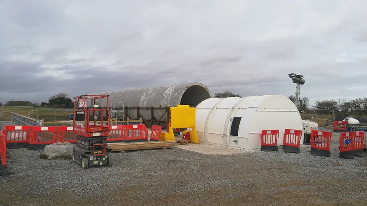 The construction launch site for all tunnel construction works is located in Goxhill. The launch shaft for the tunnel excavation works is 60m long, 7m wide and has an 8m deep portal. An approximately 140m long ramp with a 4% gradient connects the shaft to the surface of the terrain.