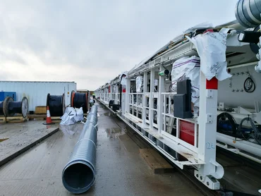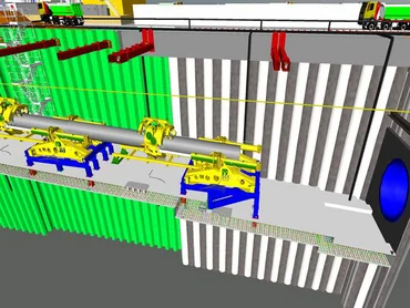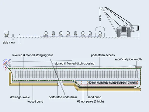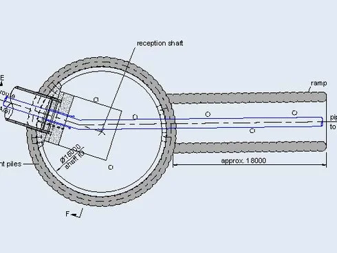 The pipes with a single length of 12m will be delivered to site by truck. Two different types of pipes will be used on the project; concrete weight coated (CWC) for the installation inside the tunnel with a pipe weight of 16t and fusion bonded epoxy (FBE) coated for installations outside the tunnel with a pipe weight of 5.9t. Unloading and stockpiling in a pipe lay down area will be done by crane using vacuum technique for the FBE pipes and traditional equipment for the CWC pipes. In a pipe stringing yard eight strings are foreseen to prepare the pipeline sections for insertion into the tunnel. Two lines are foreseen for a section length of 624m and six lines for 612m. The pipes will be semi-automatically welded allowing for a tolerance or mis-alignment of 0.5°. All welds will be inspected and tested using automatic ultrasonic testing.