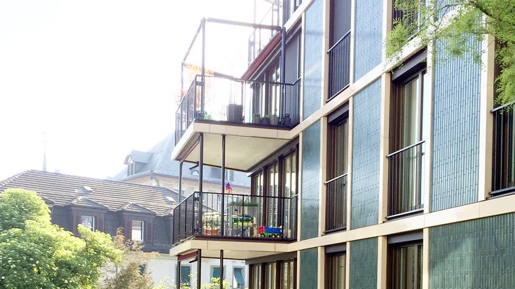 The district of Wiedikon, incorporated in 1893, is characterised by its open building structures interspersed with green spaces. The architectural team picked up on this feature of the district’s urban design, incorporating a variety of green outdoor spaces in the concept for the new build. Considerable attention was given to the choice of plants and their various blooming periods, ensuring that the green spaces’ appearances will transform completely from one season to the next. Furthermore, the skilful positioning of structures on the plot has created a semi-public space between the two buildings. Not only does this create a generous approach area to the building entrances, it also provides space for a generous play area. While the direct surroundings are characterised by classical masonry construction, Guignard & Saner opted for more contemporary designs and materials in the new buildings. This creates a visual contrast and makes the project truly eye-catching. The modern design also incorporates generous windows and doorways, which provide plenty of natural light and allow the buildings’ interiors and exteriors to coalesce. The apartments, which range from 2.5 to 4.5 rooms in size, have a surface area of between 58m² and 113m². Each accommodation unit boasts its own balcony or terrace, and all areas have been fit-out to a high standard. This includes the stairwells, for example, which have been finished using exposed concrete, while the apartments’ flooring features diagonally laid parquet flooring with surrounding frieze. Both houses are certified according to the Swiss Minergie standard for low-energy buildings.