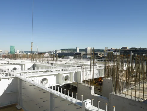 ###PDFCOLUMNBREAK###A large, cantilevered section was also constructed above the first floor, with loads from the eight floors above applied to this section. The ceiling for the entire first floor serves as a solid transition slab for the floors above – i.e. from the second to sixth floors – or to the ninth floor in taller sections of the building. The second cantilevered section with a transition slab, this time on the sixth floor, bears the load from the floors above, from the seventh to the ninth floor. The ceiling above the first floor is made up of a total of 13 load-transfer girders. The original intention was to install these beams with section dimensions of 3.13m x 1.80m and as pre-stressed reinforced-concrete girders. However, due to stress effects arising from the building’s dead load and live load, and the resulting short-term and long-term deformation this would cause, all of these load-transfer girders were realised in structural steel. The team erected the ceiling above it as a steel-concrete composite construction.