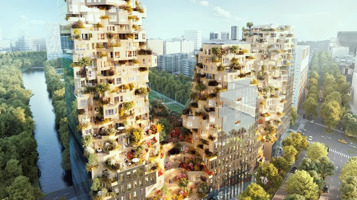 Green buildings are springing up all over the world. In Amsterdam for example. The Valley project by MVRDV brings nature to the city. The three towers are open to the public up to the fifth floor. Entrances to the shops and offices are enclosed in natural stone. Huge skylights let in the light while simultaneously serving as ponds. The glass facade blends in perfectly with the surroundings of the business quarter, while the offices are fitted with floor-to-ceiling windows. An automatic irrigation system takes care of the trees and plants. And – at a height approaching 100 metres – there’s also a skybar.