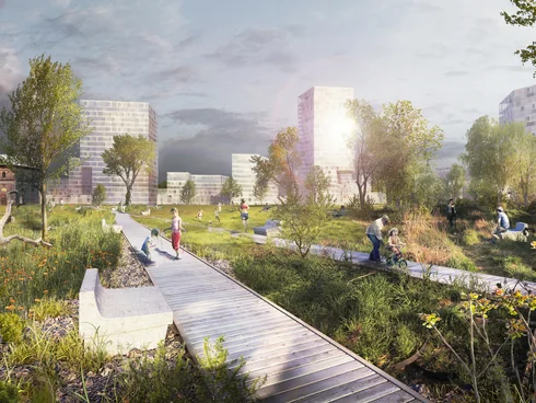 The 9.3-hectare recreational area will also provide a habitat for many animals and plants. Like sand lizards, strictly protected green toads, 150 species of wild bee, different butterflies, the black-backed meadow ant, rare species of bird, hares, and kestrels. In the middle of the city. What’s more, parts of the old railway will be preserved along with two pond areas and the existing trees. There will be wooden walkways and a playground. As well as dog zones, drinking fountains, seating, places for nature watching, a skate park, a bicycle course, and much more.