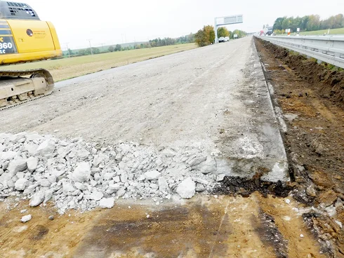 Im ersten Schritt wurde die bestehende Fahrbahnoberfläche mittels eines Betonplatten-Resonanzbrechers abgebrochen. Dabei handelt es sich um eine effiziente und wirksame Maßnahme zur Entfernung von Betonplatten. Die Baumaschine vom Typ RB 500 hat bei hoher Frequenz (44 Hz) und niedriger Amplitude (19 mm) den bestehenden Zementbetonestrich in kurzer Zeit buchstäblich zerquetscht. Insgesamt fielen so 18.000 m³ Betonsplitt an, die beim neuerlichen Aufbau wiederverwendet wurden.