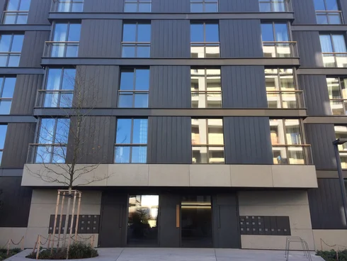 Der Maßtoleranzausgleich zwischen den verschiedenen Gewerken schafft auf vielen Baustellen Probleme. Auch in diesem Fall war eine gründliche Planung nötig. Die zickzackförmig ausgebildete Gebäudehülle aus Blech, die etwa auch sämtliche Fensterleibungen sowie Vor- und Rücksprünge von Loggien umfasst, wurde auf einem 50 mm Raster geplant. Die komplizierte Geometrie sowie die Maßtoleranzen des Rohbaus machten es schwierig, die Blechverkleidung in allen drei Achsen exakt auszurichten. An ein paar Stellen waren trotz höchster Sorgfalt Kunstgriffe nötig, um entstandene Toleranzen bei der Montage aufnehmen zu können. Die reduzierte Gestaltung der Architektinnen und Architekten führte dazu, dass das Durchhängen der Decken bei großen Spannweiten (5 m) sichtbar wurde. Diese Problematik wurde in Absprache mit der Planergemeinschaft durch die Installation eines Vorhangbrettes entlang der Glasfassade gelöst.
