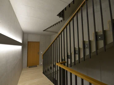 Eine weitere Herausforderung stellten die von der Planergemeinschaft gesetzten Vorgaben für die Eingangshalle dar. Auf etwa halber Höhe der rückwärtigen Wand schließt in der Eingangshalle die Decke über dem Untergeschoss an. Um den sichtbaren Betonierabschnitt der Decke über dem Untergeschoss in der Rückwand der Eingangshalle zu vermeiden und damit die Decke unsichtbar anzuschließen, wurde der Anschluss zwischen Decke und Wand mittels Rückbiegeanschluss hergestellt. Um horizontalstoßfreie Sichtbetonoberflächen herzustellen, wurden Schalelemente in Überlänge von 3,70 m beschafft und die Rückwand in einem Betonierabschnitt raumhoch betoniert.