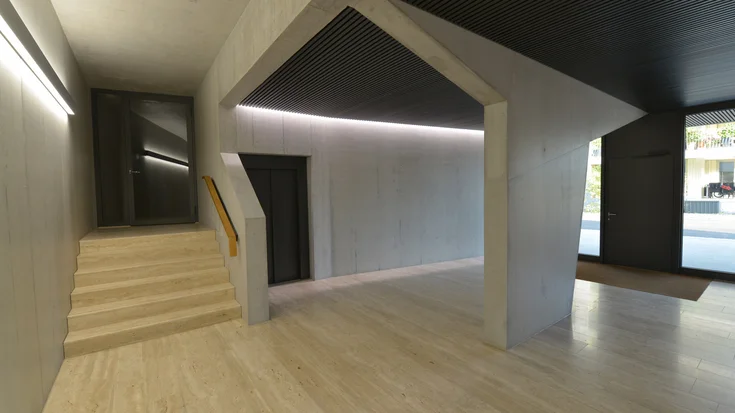 Aufgrund der überdimensionalen Abmessungen stellte die PORR eine scheibenartig ausgebildete Betonstütze in der Eingangshalle direkt vor Ort her. Durch ihre außergewöhnliche Form konnten die Stützen nicht ohne sichtbare Stöße geschalt werden. Um das von den Architekten gewünschte optische Resultat zu erzielen, mussten die Ausführung der Stöße, die Schalungstypen und Sichtbetonklassen exakt den Vorgaben entsprechen. So entstand in Verbindung mit dem durchsichtig ausgeharzten Travertinboden, den hellen Sichtbetonwänden und –stützen sowie der Rasterdecke mit Wallwashern ein großzügiger Eingangsbereich.