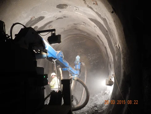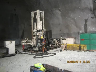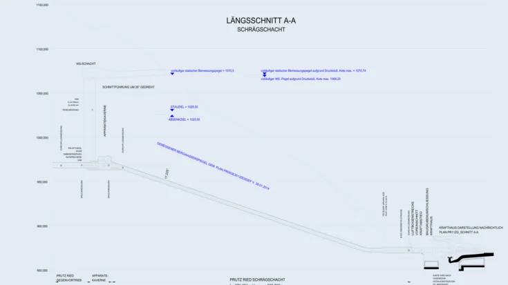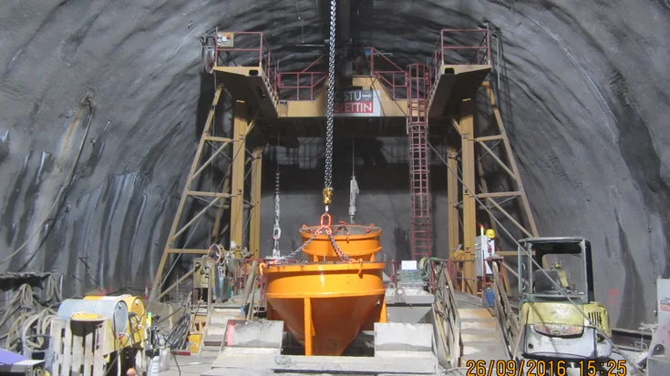 Besonders anspruchsvoll stellten sich die untertägigen Bauarbeiten für den 380 m langen Schrägschacht dar, der mit einer Neigung von 31 % und einem Querschnitt von ca. 23 m² von unten nach oben aufgefahren wurde. Da die radgebundene Logistik bei dieser starken Neigung an ihre Grenzen stößt, kam eine Mischung aus Raupen- und Reifenbetrieb zum Einsatz. Um die vorgegebenen Termine einzuhalten, wurden die Vortriebsarbeiten vorgezogen und bereits Ende Februar 2015 aufgenommen. Der Ausbruch des Schrägschachts konnte nach nur vier monatiger Bauzeit ohne größere Probleme abgeschlossen werden.