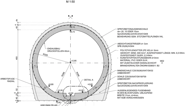Bei der Auskleidung des Druckstollens kam bis zum Konus eine unbewehrte Ortbetoninnenschale zum Einsatz, die in den ersten 773 m ab der Apparatekammer rundum abgedichtet wurde. Die restlichen 230 m bis zur Demontagekaverne sind nicht abgedichtet. Für die Innenschale des Gegenvortriebs wurde vor dem Einbau der Abdichtung im Sohlbereich ein Zwickel aus Spritzbeton eingebaut. Ziel war ein nahezu kreisrundes Profil, da der hohe Wasserdruck und der drohende Quelldruck keine größeren Abweichungen von der Kreisform zuließen. Nach dem Einbau des Spritzbetonzwickels brachte die IAT GmbH die Abdichtungsfolie in der Sohle an. Im unabgedichteten Bereich erfolgte ein Trennanstrich aus Kalk. Um eine Befahrbarkeit der Sohle wieder herbeizuführen, wurde der unbewehrte Sohlbeton blockweise von der Apparatekammer in Richtung Demontagekaverne über Kopf errichtet. Die Abdichtung des Gewölbes erfolgte parallel zum Betonbetrieb während der Nachtschicht. Nach Erreichen der vorgeschriebenen Druckfestigkeiten wurde die fertige Innenschale mittels Spaltinjektion vorgespannt. Eine Überprüfung der Vorspannwirkung erfolgte mittels Laserscanner-Messung und Echtzeitauswertung der Ergebnisse.