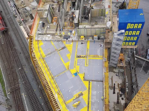 Auf der Decke ĂŒber dem zweiten Obergeschoss wurde in Zusammenarbeit mit der Doka ein auskragendes Schutzplateau hergestellt, um das dann wieder in Betrieb genommene Bahngleis vor herabstĂŒrzenden GegenstĂ€nden zu schĂŒtzen.
