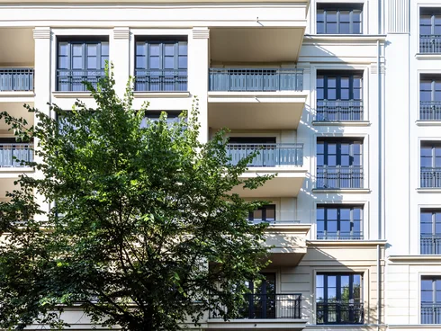 Von außen zeichnet sich der Komplex durch seinen klassischen Stil aus, der stimmig mit modernen Elementen ergänzt wurde. Durch die stilistische Aufnahme der gründerzeitlichen Altbauarchitektur der unmittelbaren Umgebung fügt sich der Neubau harmonisch in das Stadtbild ein.