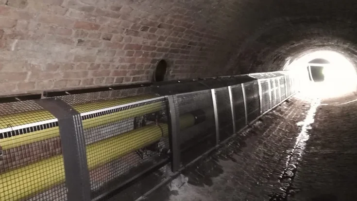 Im Kanal wurden auf einer Länge von 2 x 294 m ummantelte Stahlrohre vom Typ DN 200 PE auf verzinkte Epoxid – Teerharz beschichtete Konsolen verlegt.