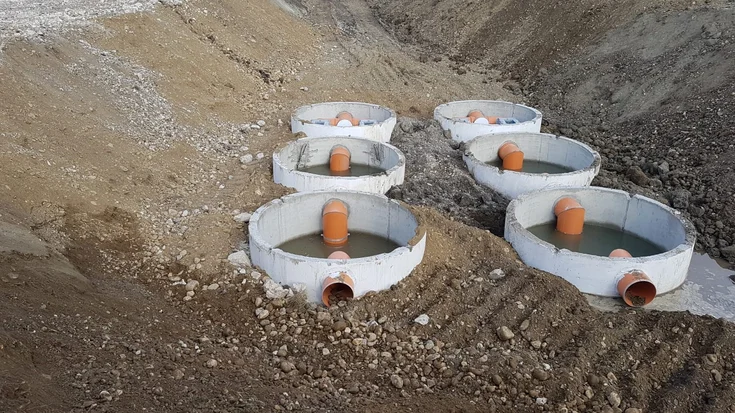 A discharge chamber is located at the very end of the drainage system. The water is collected here and directed into the River Barsa. To ensure the water can flow into the river, a 27m long concrete surface has been built, followed by a 30m long concrete beam. The river had to be diverted for the concrete to be poured.