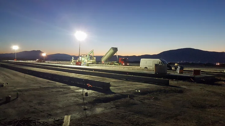 The final part of the work was to install the lighting system: three 28m light masts. Each mast has four LEDs, a control panel and a lightning conductor. The foundation is 2.4m high and includes all necessary cables and ducts. It is made of class C30/37 reinforced concrete.