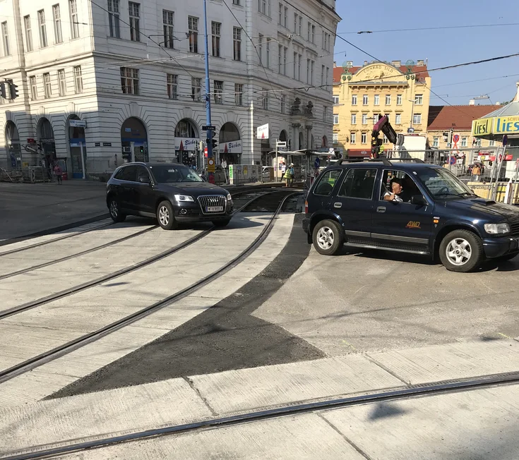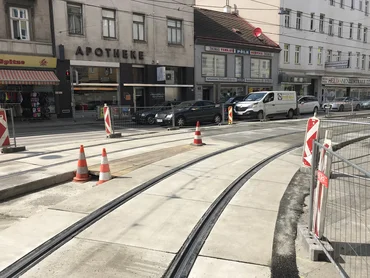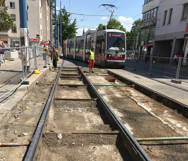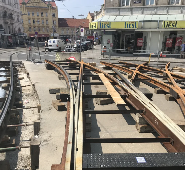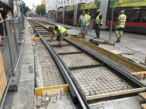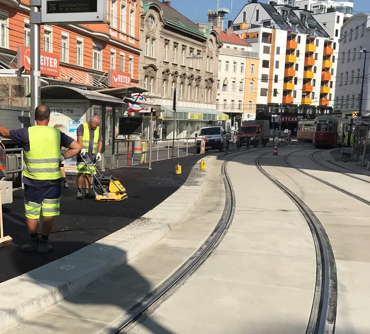 In the last two construction phases, the distance to the neighbouring buildings was large enough to switch to the simpler sound-insulated superstructure. In the course of the track replacement, the existing track support slab was milled and concreted after alignment. As the curve from Prager Straße towards "Am Spitz" was very narrow, a lubrication system was installed at the start of each curve in order to minimise the squeaking of the rails in the curve area by means of a lubricating film. There were also two stops in this area that had to be renewed and were therefore closed by Wiener Linien for a fortnight. Once the new kerbs had been laid, the Vienna branch of PORR Tiefbau laid the asphalt surface.