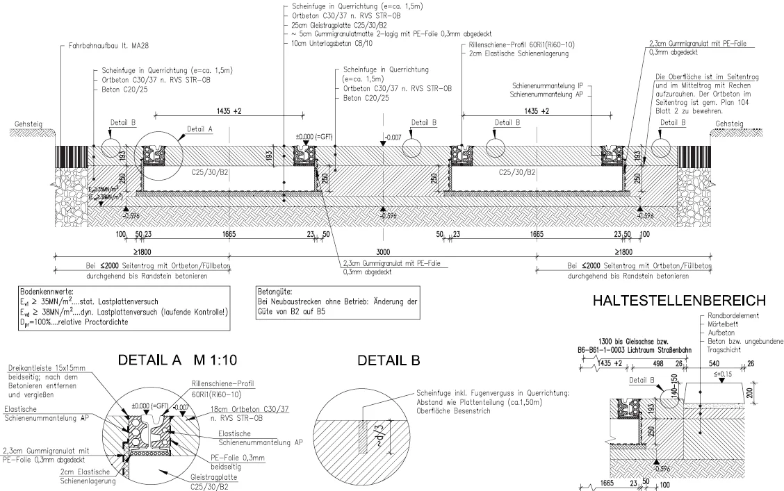 Due to the densely populated project environment, the client specified at the planning stage that the sound-insulated and highly sound-insulated superstructure would be used. With the sound-insulated superstructure, the encased rails are laid on an unreinforced track support slab. The highly sound-insulated superstructure is a lightweight mass-spring system with a thickness of 25 cm. The track base plate, which is reinforced with a reinforcement cage, is separated from the filler concrete at the sides and from the clean layer at the bottom by elastic rubber mats in order to reduce the vibrations caused by the tram.