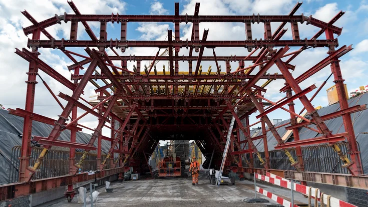 The tunnel’s projecting foundations shored up the formwork carriage in standard profile F. For profiles D and E, the formwork carriage and secondary carriage were separated along the centre. This meant a new, additional support had to be created to shore up both carriage sections. It took one week to convert the formwork carriage and secondary carriage. Steel plates were used for the foundations; these were embedded directly onto the levelled ground in the excavated construction pit. In the curved section, the length of the formwork carriages was reduced by half to make sure that they did not damage the walls when moving on to the next casting stage. Shortening the formwork carriage also took one week. Where the ceiling widens, the ceiling formwork was supplemented using conventional techniques.