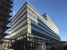 The facade elements for the building on site F feature a combination of materials including different natural stones and glass brick elements framed in metal profiles. They arrived on site as prefabricated elements and were installed in one piece.