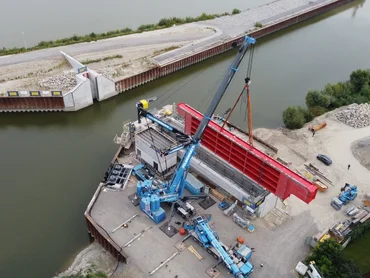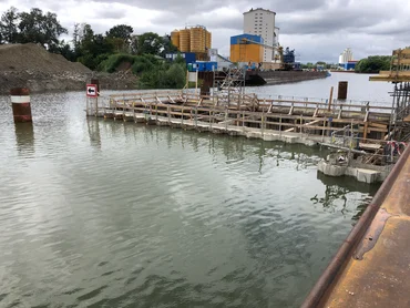 Following completion of the concrete construction work, the temporary construction pit was successfully flooded and the sheet piling enclosure could be dismantled on schedule. In early September 2021, the harbour gate, weighing some 250 tonnes, was lifted into place in two parts.