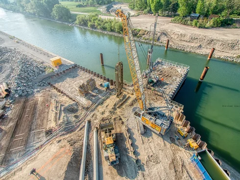 The diaphragm walls were built to a depth of around 25m. These had to serve as a deep foundation for the sill and the counter-structure, while also meeting the necessary requirements for a sealing wall. One area of particular focus was integrating the diaphragm wall into the existing dam so as to ensure the tightness requirements for flood protection. Once the diaphragm wall elements on the sheet-piled peninsula were complete, the jet-grouted sealing base had to be created at the same time as the construction of the diaphragm wall, due to the tight and complicated schedule. The jet-grouted sealing base is a key element of the complex construction pit solution, as the construction pit had to withstand water pressure of around 10m when excavated, and the lower edge of the sheet piling wall rested on the extremely permeable Danube gravel.
