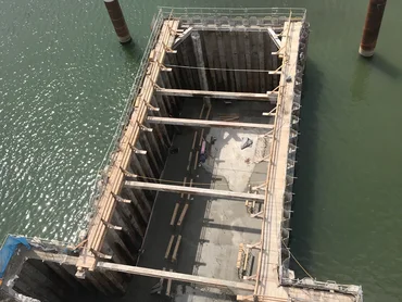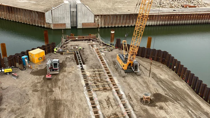 Once the finished sheet piling enclosure had been braced with mobile reinforcing frames, it was filled with compactable material and the guide walls for the connecting in-situ concrete diaphragm walls were installed. The construction of the diaphragm walls proved particularly challenging due to the highly restricted space on the sheet-piled peninsula and the conversion work on the bracing structure as part of the process.