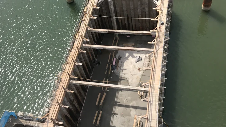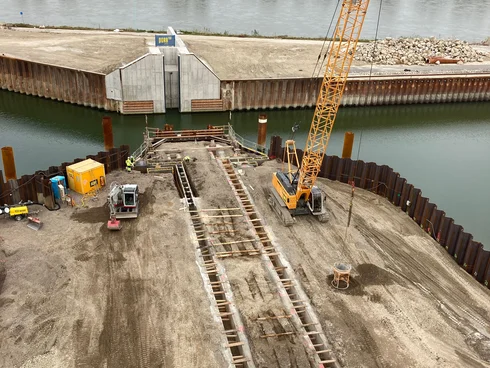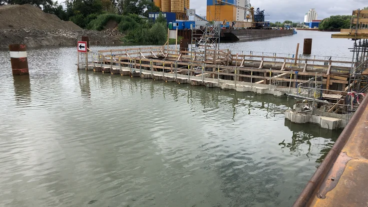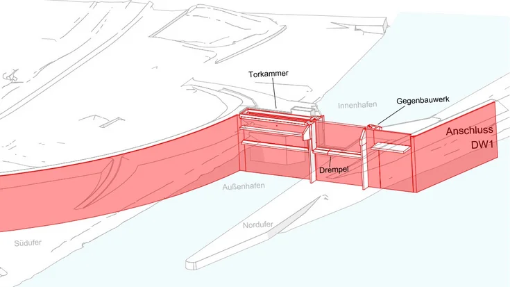 To create the connection with the completed sill section in construction phase 2, which involved erecting the gate chamber and sill on the southern side, a special transverse bulkhead structure was designed to serve as a new end face for the sheet piling enclosure to the south. The creation of a horizontal joint seal between the lower edge of the transverse bulkhead and the upper edge of the sill, including the gate rail, was the subject of particular attention, as the transverse bulkhead could only be positioned on the sill, not structurally connected to it.