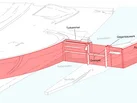The foundations of the gate chamber rested on the diaphragm walls and were anchored back to the sheet piling for the quay wall using deadman anchors. This allowed the construction pit to be excavated between the diaphragm walls while the walls themselves were being completed.