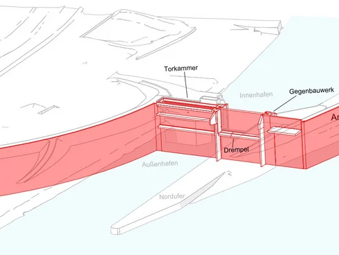 The foundations of the gate chamber rested on the diaphragm walls and were anchored back to the sheet piling for the quay wall using deadman anchors. This allowed the construction pit to be excavated between the diaphragm walls while the walls themselves were being completed. Besides the gate rail in the sill, the horizontal and vertical gate guide rails, drive motors, slewing crane, ice prevention systems and lateral reinforcements all had to be cast in first-stage concrete. The operations building and pumping station were built at the same time as the construction in the gate chamber.