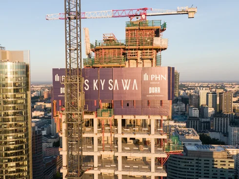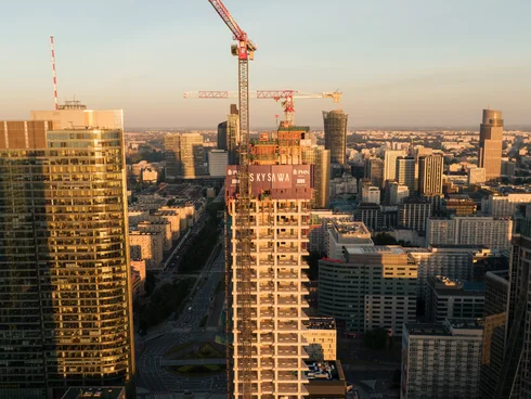 SKYSAWA ist das erste Bleistiftgebäude der Stadt – ein Wolkenkratzer mit einem kleinen Geschossquerschnitt. Nur 400 m beträgt er in den oberen Etagen. Die Bauarbeiten am oberirdischen Teil des Turms dauerten überhaupt nur ein Jahr. Die Stockwerke 17 bis 40 hat die PORR in 150 Tagen errichtet. Wie das geht, erklärt Bauleiter Michał Kacperowski: Durch den Einsatz einer fortschrittlichen Schachtstruktur, bei der ein großer, komplexer Schacht in zwei Teile unterteilt wird, konnte für jede Schachthälfte ein Tempo von vier Tagen erreicht werden. Die Struktur der Decke, die in drei Parzellen unterteilt ist, folgte dem Kern ebenfalls in einem Vier-Tage-Zyklus bis zur nächsten Etage. Der erste der sieben Krananker fügte sich in diesen Zyklus ein und erreichte eine Hubzeit von drei Tagen. Wenn man dieses Tempo systematisch beibehält, steigt der Bau in einem Monat um fünf Stockwerke. Das ist ein Rekord für den Hochbau in Polen.