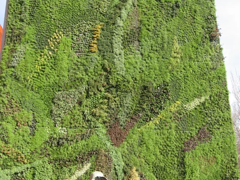 Blancs patentierte Pflanzenwände wachsen an einem Leichtmetallgerüst, das PVC-Hartschaumplatten trägt. Auf die Platten kommt eine Lage Filz aus recycelten Acrylfasern. In einer zweiten Lage Filz sind Schlitze geschnitten, sodass die Pflanzen zwischen den beiden Filzlagen gesetzt werden können. Damit die Filzwände nicht reißen und keine Pflanzen herunterfallen, sind die beiden Filzwände mit Edelstahlklammern fest getuckert. Das Acryl aus Altkleidern bietet einen reichhaltigen Nährboden für viele Mikroorganismen, Bakterien und Pilze. Ganz oben befinden sich Bewässerungsrohre, die per Zeitschaltuhr gesteuert werden.