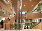 Das Langeveld Gebäude am Campus der Erasmus-Universität Rotterdam ist mit seiner Punktzahl von 91, 5 % im BREEAM-Zertifikat ein Vorzeigeprojekt im modernen Bildungsbau. Fertiggestellt wurde es 2023. Mit viel Licht, großzügigen Grünflächen und flexiblen Nutzungsmöglichkeiten ist es Rückzugsort, Lernoase und Kommunikationsraum. Das Team von Paul de Ruiter Architects orientierte sich bei der Planung an zirkulären Prinzipien und biophilem Design. So bestehen viele Bauteile aus recycelten, biobasierten und wiederverwendeten Materialien aus Abrissprojekten der Universität. Auf der Grundfläche von 8.748 m² sorgt viel Grün für ein angenehmes Klima. Innenstehende Kübel, deren Bepflanzung nach Außen wachsen kann, locken nicht nur heimische Insekten an, sogar Vögel bauen ihre Nistplätze zwischen den Blättern. Die Begrünung kommt auch dem innovativen Belüftungssystem Powered by Nature zugute: Nach dem Vorbild von Termitenhügeln werden die Räume mit der Kraft von Sonne und Wind auf natürliche Weise belüftet. Dieses System reduziert nach Angaben des Architekturbüros den Energieverbrauch für die Klimatisierung um satte 85 %. Insgesamt ist der Neubau ein top Bildungsbau, der das Attribut Vorreiter verdient – ganz wie sein Namensgeber: Frau Prof. Henny Langeveld (1926–2004), die erste Professorin an der Erasmus-Universität Rotterdam.